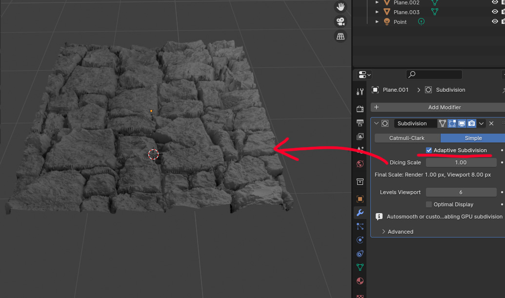 displacement가 이미지로 재질의 표면을 표현하는 건 좋지만, 이미지의 해상도를 3d에서 온전히 구현하기 어렵다는 한계가 있었습니다. 이는 모든 렌더 개발자들의 고민이었는데, 블렌더는 그 해답으로 adaptive subdivision 방식을 제공합니다.