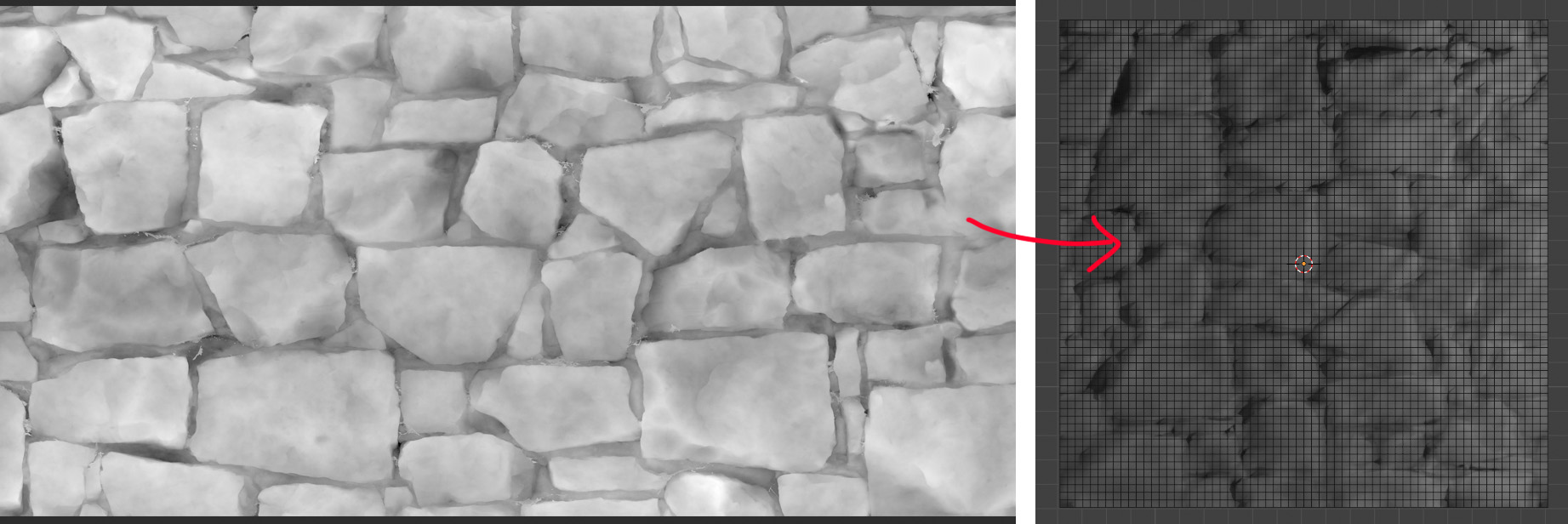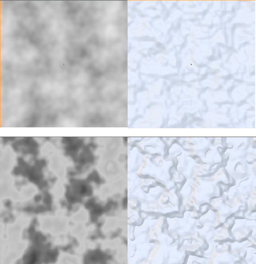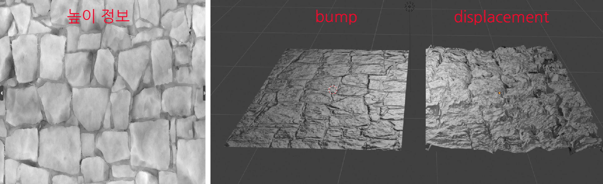 둘 다 흑백의 이미지를 입력값으로 받아 표면 정보를 표현합니다. 높이가 높은 곳은 밝은 색으로, 높이가 낮은 곳은 어두운 색으로 표현해 상대적인 수치로 재질의 높낮이를 표현해 주게 됩니다.
