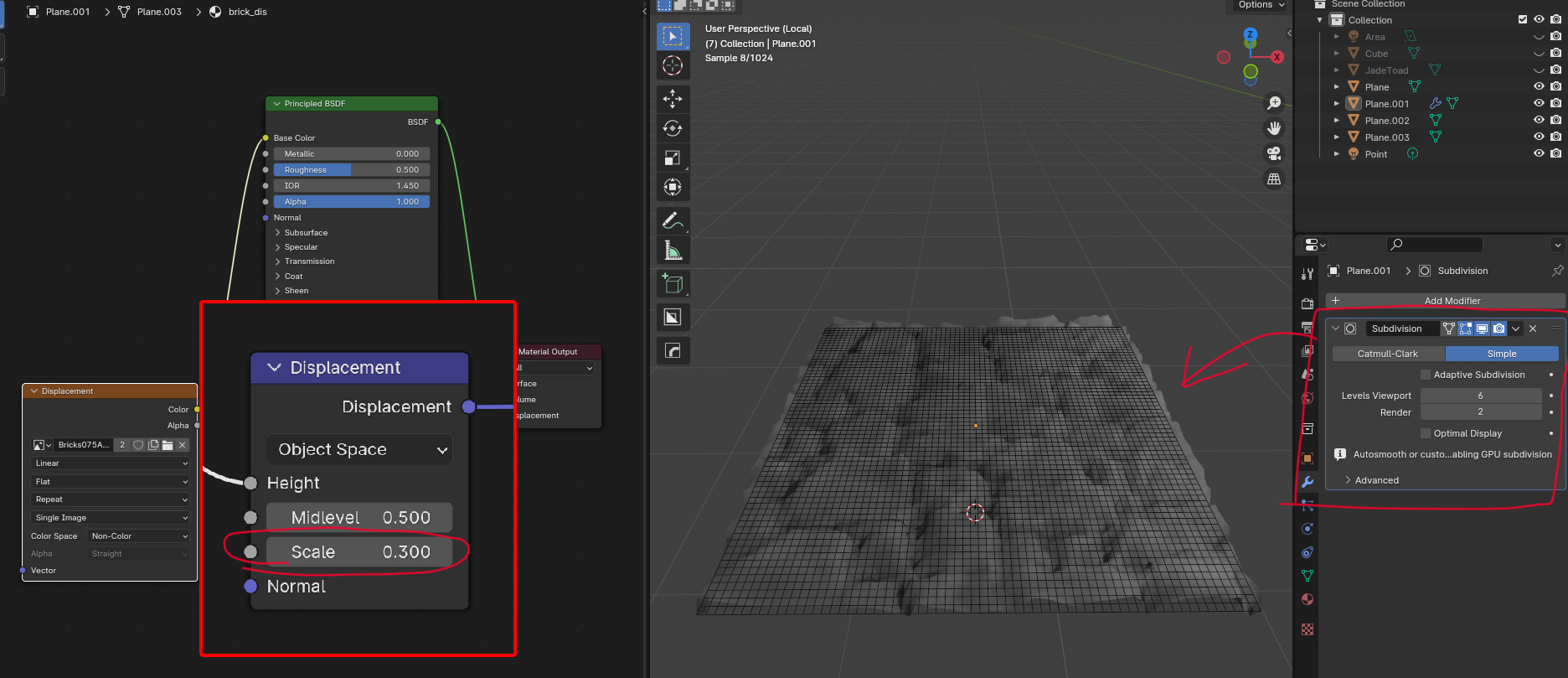아래 그림처럼 subdivide 모디파이어를 사용해 면을 많이 나눠줘야 displacement가 그럴듯하게 작동하는 걸 볼 수 있습니다. displacement나 bump는 종종 강하게 표현되는 경우가 있어서, scale을 좀 낮춰가면서 조절해 보시면 됩니다.