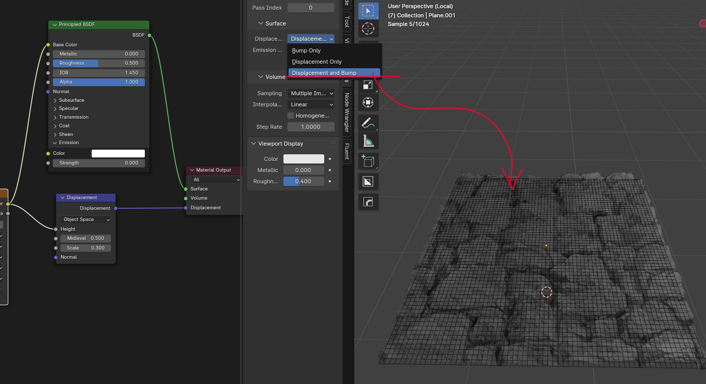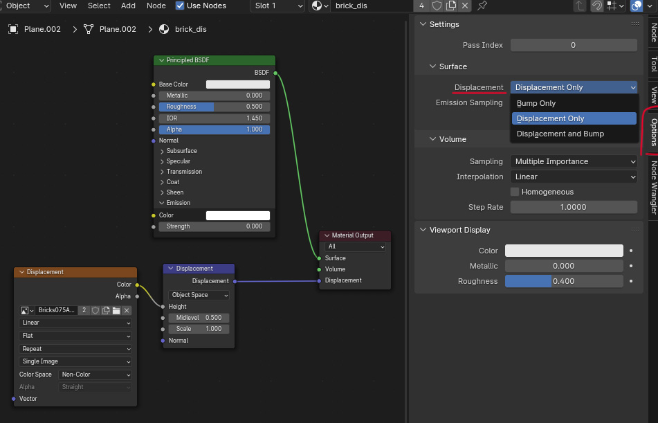 그런데 이렇게 연결해도 displacement가 작동하지 않습니다. 블렌더에서 displacement를 사용하려면, 별도 설정이 더 필요합니다.