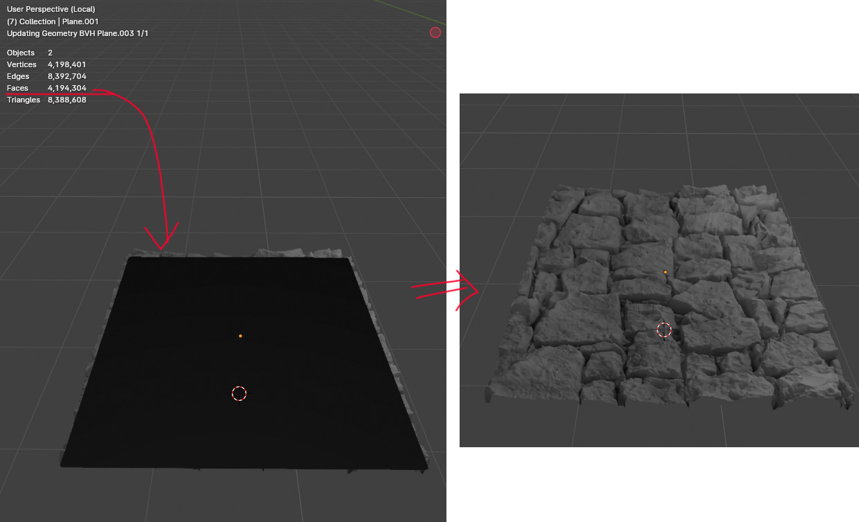 아래 그림에서 보는 것처럼 면을 400만 개 정도로 subdivide 해주자 displacement가 아주 리얼하게 표현되는 걸 알 수 있습니다. 왼쪽은 와이어 프레임을 켠 상태입니다. 근데 면이 너무 많아 까맣게 보이는 것뿐입니다.