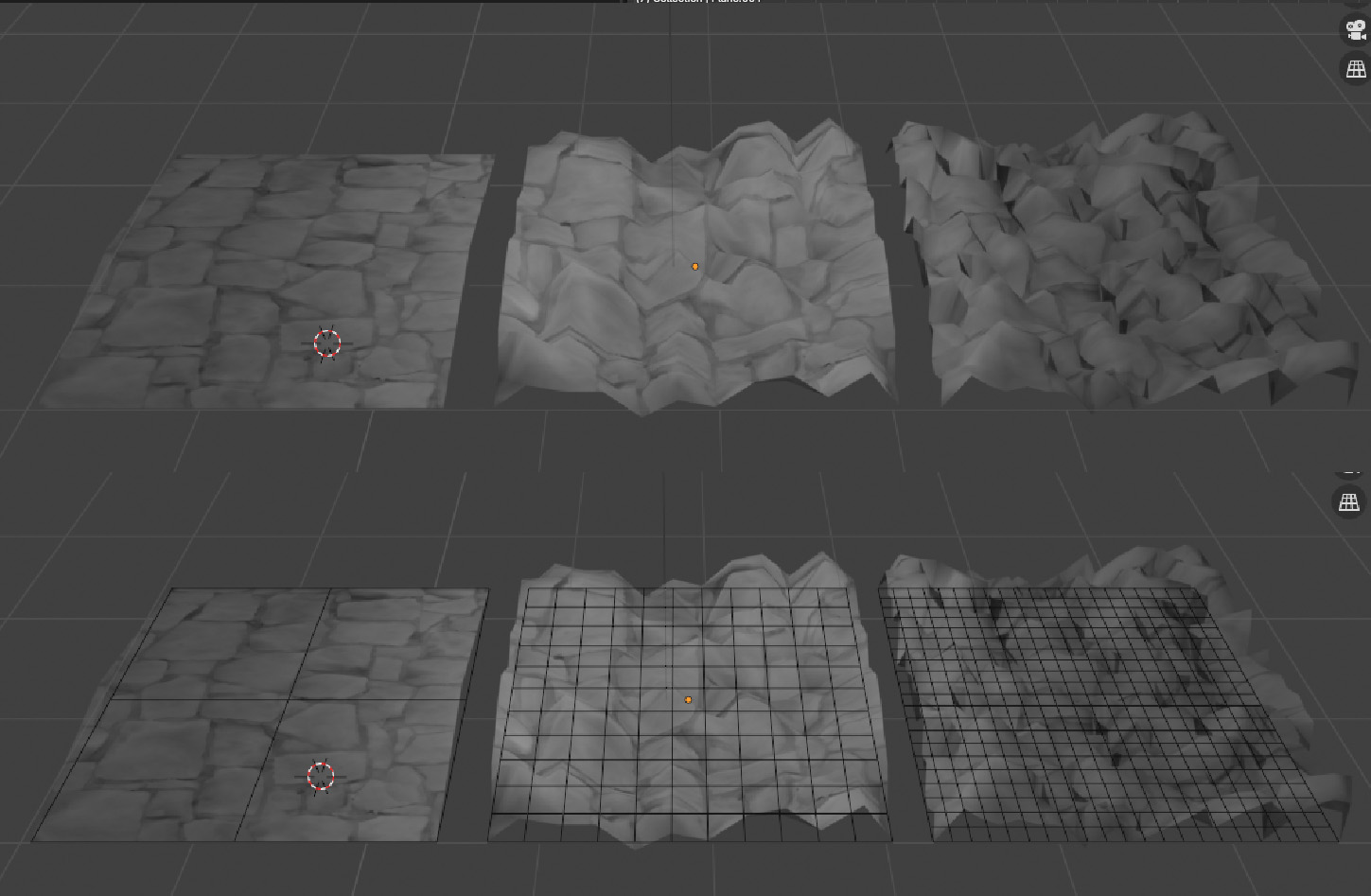 displacement는 3d 상에서 오브젝트의 면을 실제로 움직여서 이미지의 높낮이를 표현합니다. 따라서 아래 그림처럼 오브젝트에 실제 움직일 면이 많아야 displacement가 제대로 표현됩니다. 면을 늘려줄수록 displacement의 디테일이 살아나는 걸 볼 수 있습니다.