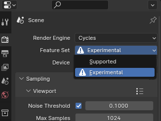블렌더에서 adaptive subdivision을 사용하려면 사이클 렌더 아래에 Experimental 옵션을 켜줘야 합니다. 실험적이라는 뜻으로, 아직 안정화되지 않았거나 실험적인 기술을 제공해 줍니다. 사용자들에게 피드백을 제공받는 등 여러 가지 이유로 이 기능을 함께 제공합니다.