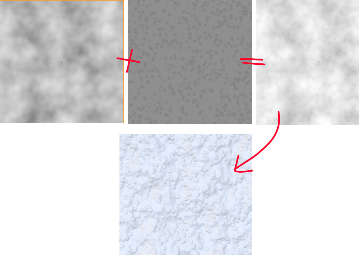 또는 아래처럼 노이즈를 섞어주면 표면이 거칠게 표현되죠. 기존 굴곡이 있던 벽에 웬 검은 점들이 튀어나온 것처럼 표현됩니다.