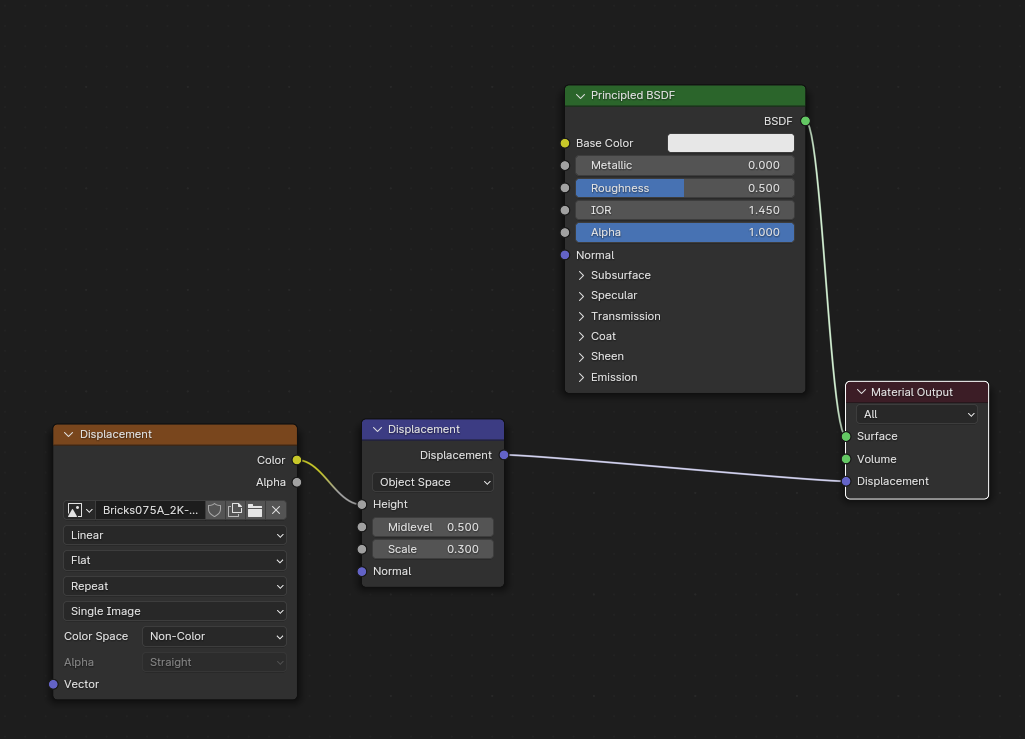 이제 다운받은 텍스처는 모두 연결하고 displacement만 남았습니다. 이 재질에서 displacement를 사용하지는 않겠지만, displacement가 뭔지 살펴보기만 하려고 합니다.