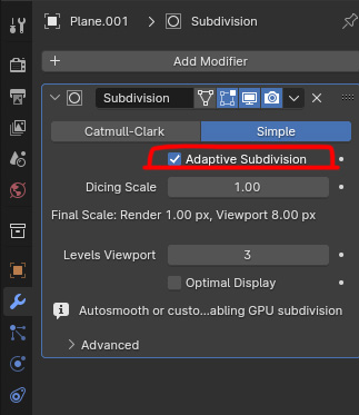 그러면 아래처럼 섭디비전 모디파이어에서 Adaptive Subdivision 항목을 사용할 수 있습니다.