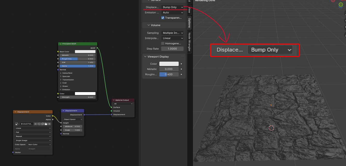 이 옵션의 초기 세팅이 Bump Only로 되어 있어서, displacement 노드를 연결하면 기본으로 bump가 표현됩니다. 처음 블렌더를 접하시는 경우에 bump가 표현되는 것만 보고 displacement가 제대로 표현되고 있다고 착각하시는 경우가 종종 있는데, bump가 표현되는 거지 displacement가 표현되는 게 아닙니다. displacement 노드의 옵션을 건드려도 메쉬가 변하지 않습니다.